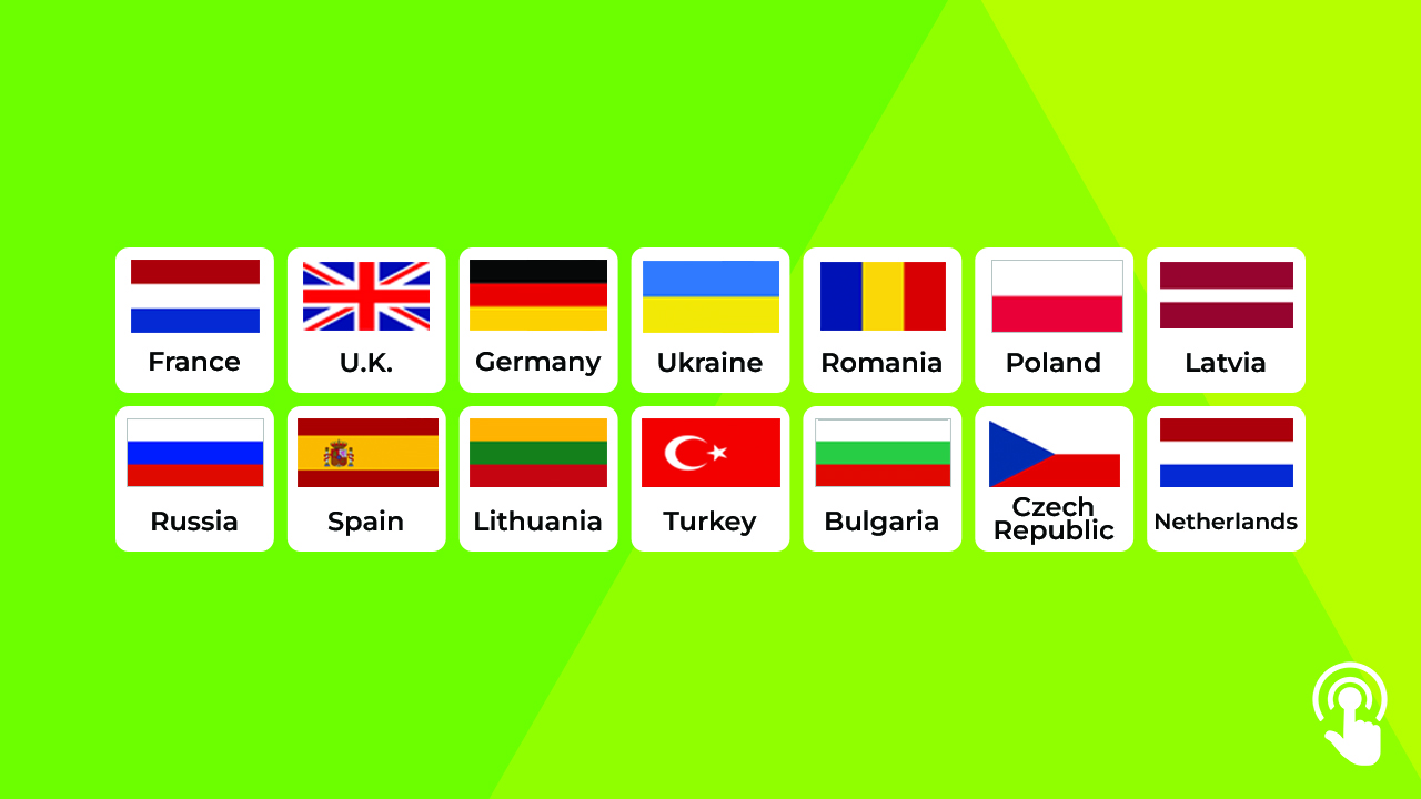 Hieronder ziet u een voorbeeld van hoe het aanraakscherm aan de receptie-kiosk er kan uitzien. Dit wordt op maat gemaakt voor uw toepassing. Uiteraard kan worden afgeweken van de getoonde landen en vlaggen, layout en huisstijl.